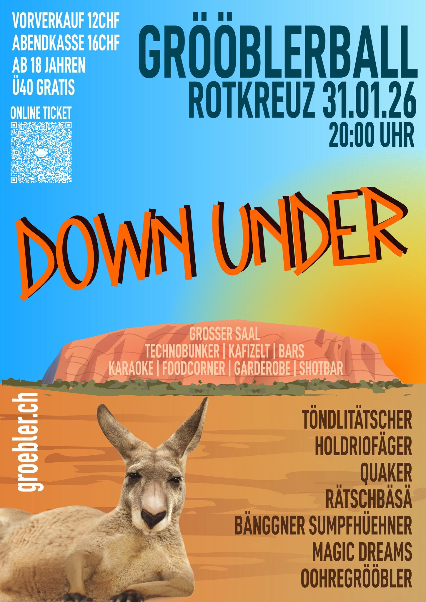 Unter dem Motto DOWN UNDER kann die Bevölkerung von Rotkreuz mitten in Australien ein Kafi zur stärkung schlürfen, ein Schaps zur Desinfektion vor giftigen Tieren trinken oder auch ein Shötli an unserer neuen Shotinsel in der Mitte des Dorfmattsaals konsumieren. Ein Abstecher in den Technobunker, oder das urchige im Aussenzelt geniessen? Dies und noch viel mehr wird am 31. Januar am Grööblerball der Guggenmusik Oohregrööbler zu bewundern sein.