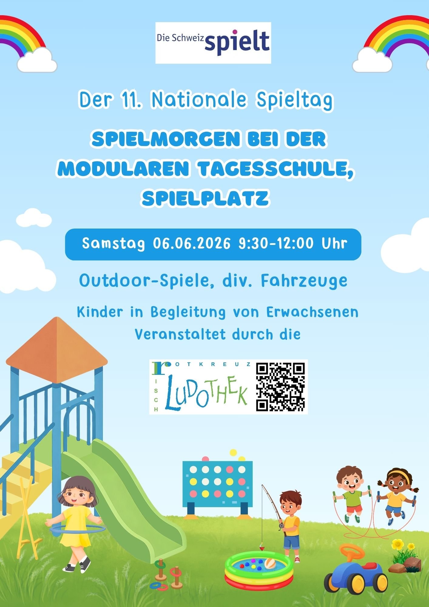 Vom Donnerstag, 28. Mai bis Sonntag, 07. Juni 2026 heisst es wieder: Die Schweiz spielt. Aus diesem Anlass organisiert die Ludothek Risch-Rotkreuz einen Spielmorgen mit diversen Fahrzeugen (geeignet bereits für Kinder ab 1,5 Jahren – ca. 14 Jahren) und Outdoor-Spielen für jedes Alter. Der Anlass findet bei trockenem Wetter am Samstag, 06. Juni 09:30 – 12:00 Uhr bei der Modularen Tagesschule - Spielplatz in Rotkreuz statt. Ein kleines Znüni steht bereit.